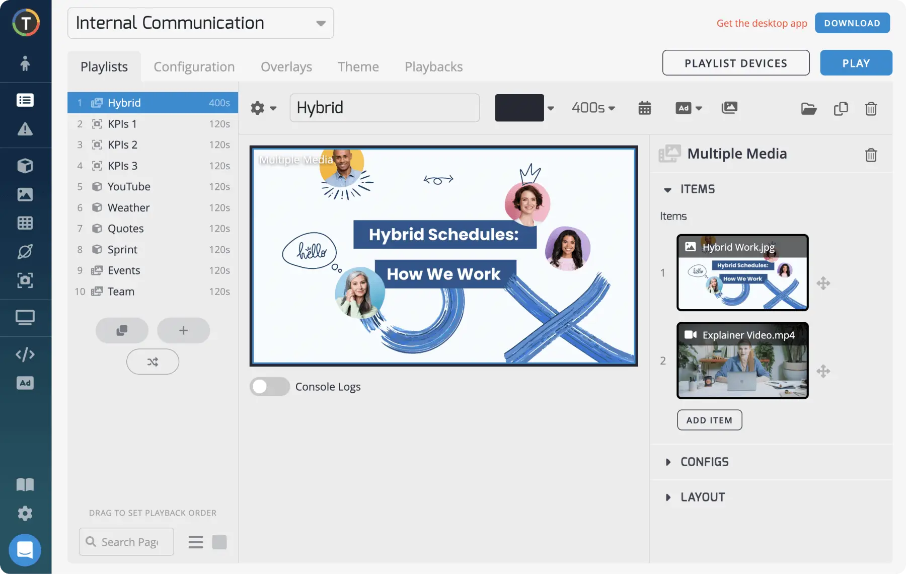 - Elevate employee engagement through targeted messaging, by delivering content programmatically based on floors or rooms within your office. Organize, schedule, and auto-expire media to ensure visuals remain current, compelling, and in line with objectives.